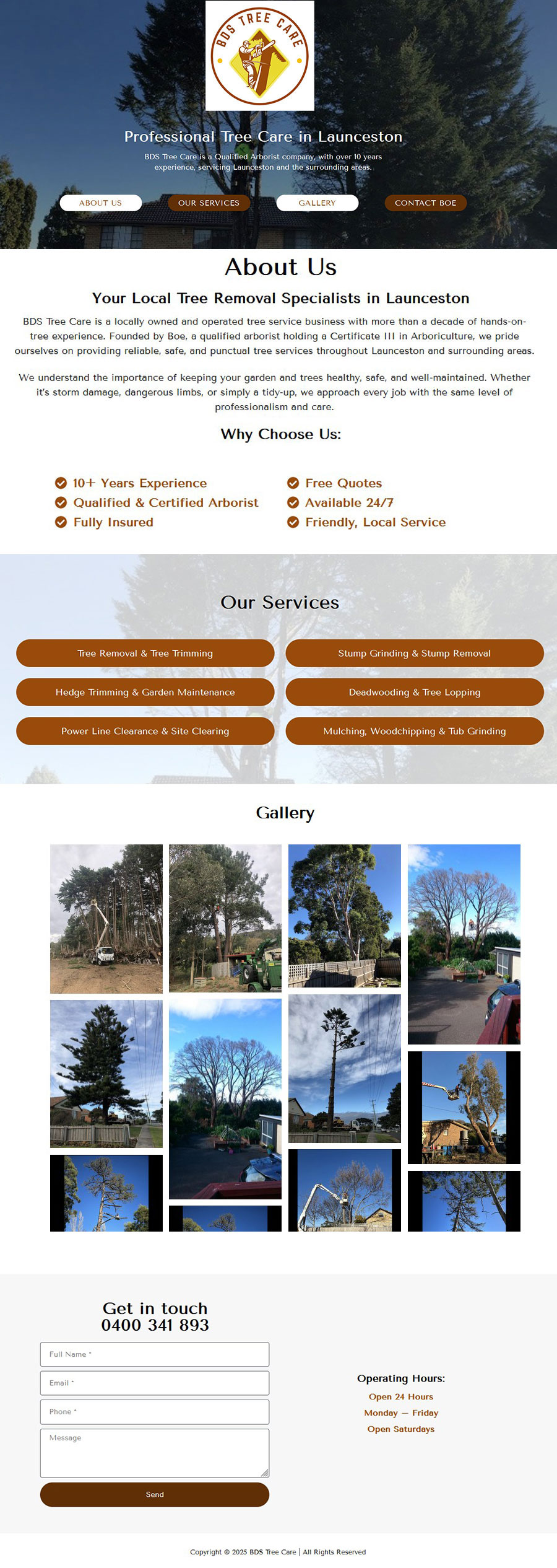 Your Local Tree Removal Specialists in Launceston BDS Tree Care is a locally owned and operated tree service business with more than a decade of hands-on-tree experience. Founded by Boe, a qualified arborist holding a Certificate III in Arboriculture, we pride ourselves on providing reliable, safe, and punctual tree services throughout Launceston and surrounding areas. We understand the importance of keeping your garden and trees healthy, safe, and well-maintained. Whether it’s storm damage, dangerous limbs, or simply a tidy-up, we approach every job with the same level of professionalism and care.